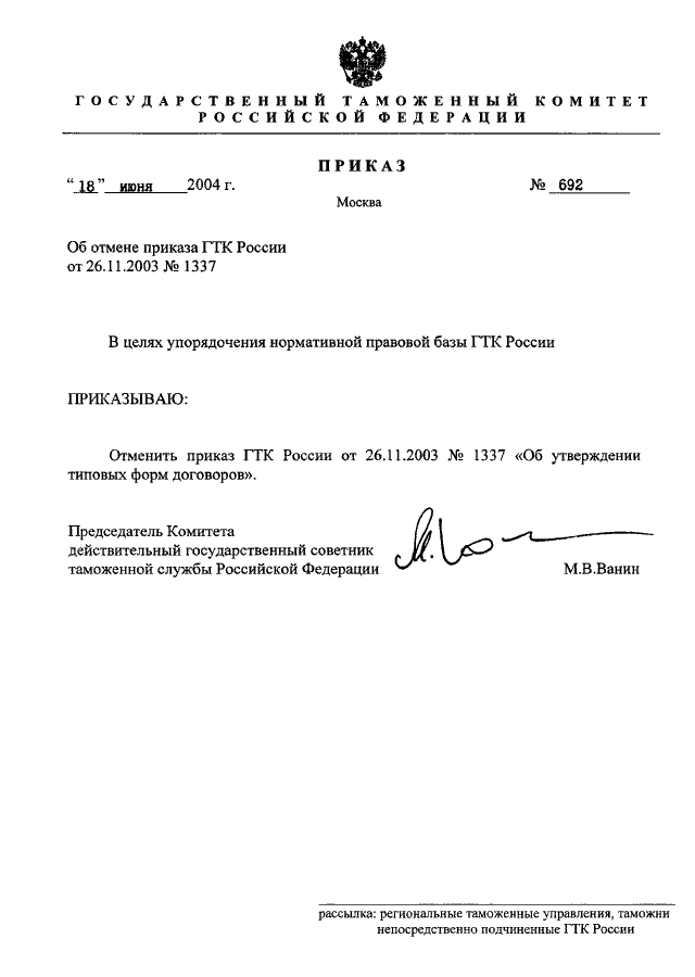 ПРИКАЗ ГТК РФ от 18.06.2004 N 692