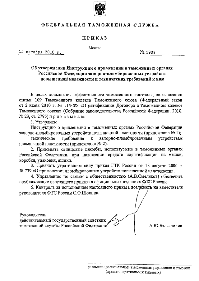 ПРИКАЗ ФТС РФ от 15.10.2010 N 1908