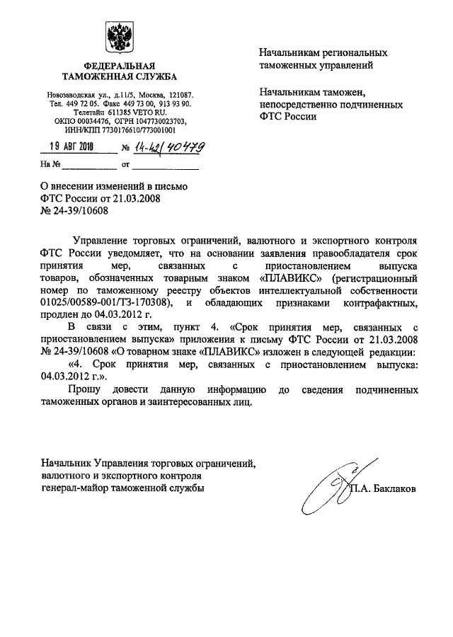 "О ВНЕСЕНИИ ИЗМЕНЕНИЙ В ПИСЬМО ФТС РОССИИ ОТ 21.03.2008 N 24-39/10608"