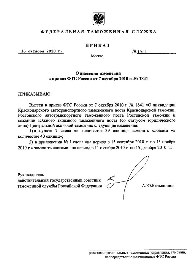 ПРИКАЗ ФТС РФ от 18.10.2010 N 1911