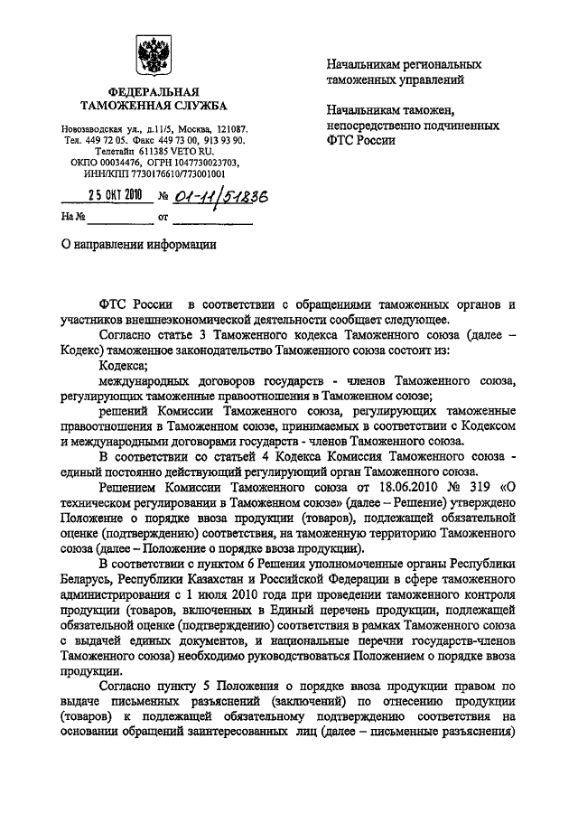 ПИСЬМО ФТС РФ от 25.10.2010 N 01-11/51836