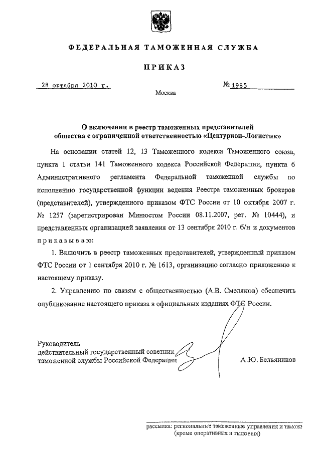 "О ВКЛЮЧЕНИИ В РЕЕСТР ТАМОЖЕННЫХ ПРЕДСТАВИТЕЛЕЙ ОБЩЕСТВА С ОГРАНИЧЕННОЙ ОТВЕТСТВЕННОСТЬЮ "ЦЕНТУРИОН-ЛОГИСТИК"