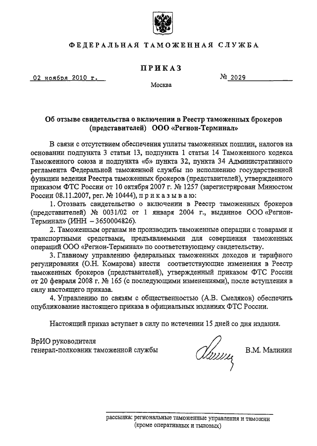 "ОБ ОТЗЫВЕ СВИДЕТЕЛЬСТВА О ВКЛЮЧЕНИИ В РЕЕСТР ТАМОЖЕННЫХ БРОКЕРОВ (ПРЕДСТАВИТЕЛЕЙ) ООО "РЕГИОН - ТЕРМИНАЛ"