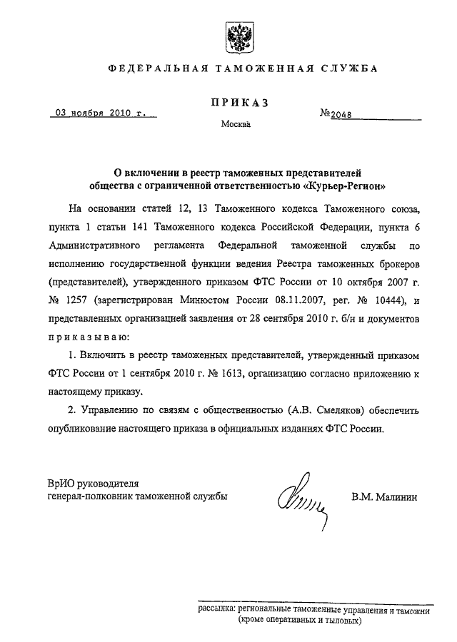 ПРИКАЗ ФТС РФ от 03.11.2010 N 2048