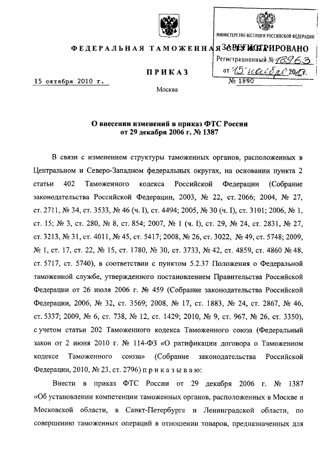ПРИКАЗ ФТС РФ от 15.10.2010 N 1890