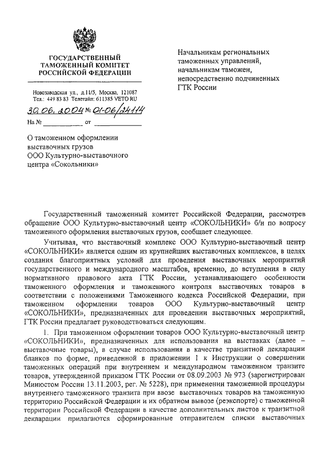 ПИСЬМО ГТК РФ от 30.06.2004 N 01-06/24114