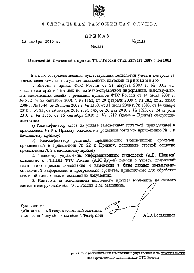 ПРИКАЗ ФТС РФ от 15.11.2010 N 2133