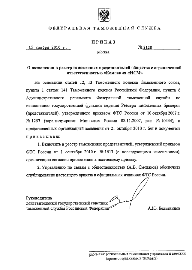 ПРИКАЗ ФТС РФ от 15.11.2010 N 2128