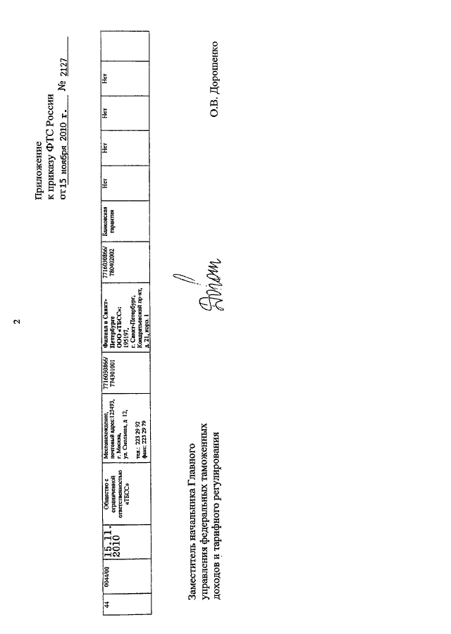 ПРИКАЗ ФТС РФ от 15.11.2010 N 2127