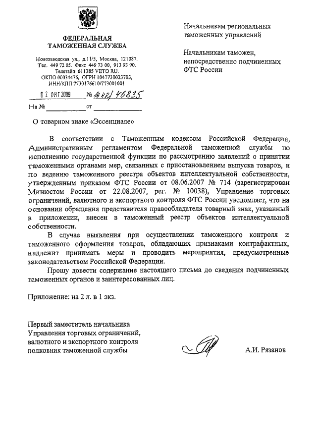 ПИСЬМО ФТС РФ от 02.10.2009 N 14-42/46835