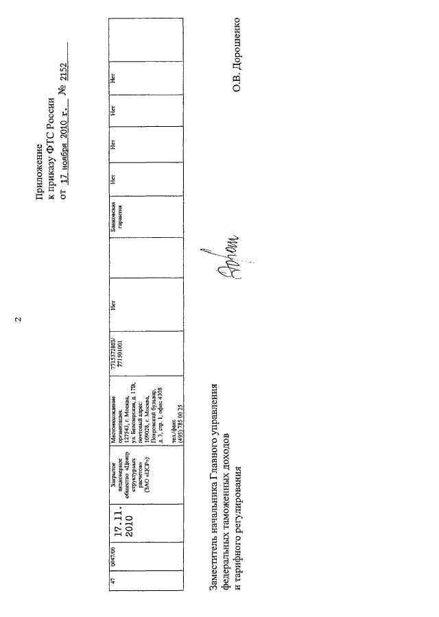 ПРИКАЗ ФТС РФ от 17.11.2010 N 2152