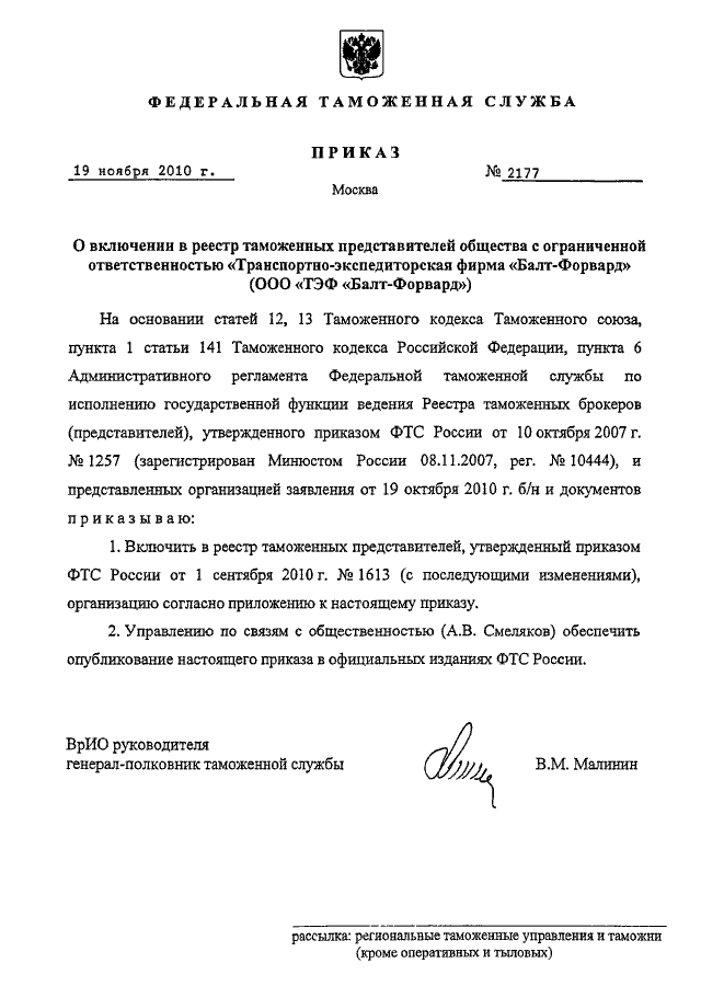 "О ВКЛЮЧЕНИИ В РЕЕСТР ТАМОЖЕННЫХ ПРЕДСТАВИТЕЛЕЙ ОБЩЕСТВА С ОГРАНИЧЕННОЙ ОТВЕТСТВЕННОСТЬЮ "ТРАНСПОРТНО - ЭКСПЕДИТОРСКАЯ ФИРМА "БАЛТ-ФОРВАРД" (ООО "ТЭФ "БАЛТ-ФОРВАРД")"