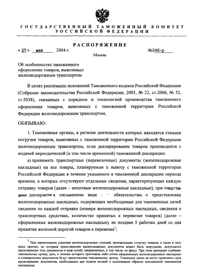 РАСПОРЯЖЕНИЕ ГТК РФ от 27.05.2004 N 246-р