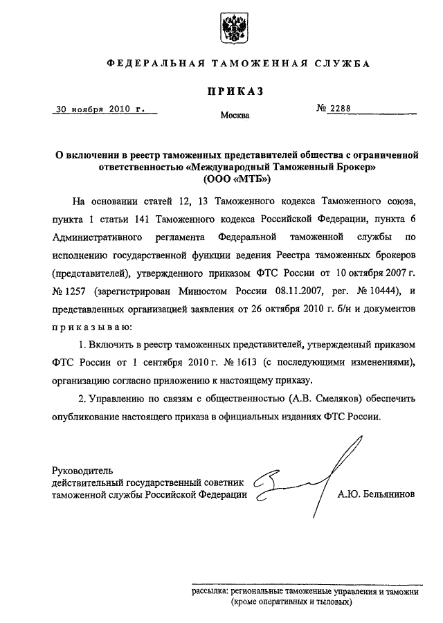 "О ВКЛЮЧЕНИИ В РЕЕСТР ТАМОЖЕННЫХ ПРЕДСТАВИТЕЛЕЙ ОБЩЕСТВА С ОГРАНИЧЕННОЙ ОТВЕТСТВЕННОСТЬЮ "МЕЖДУНАРОДНЫЙ ТАМОЖЕННЫЙ БРОКЕР" (ООО "МТБ")"