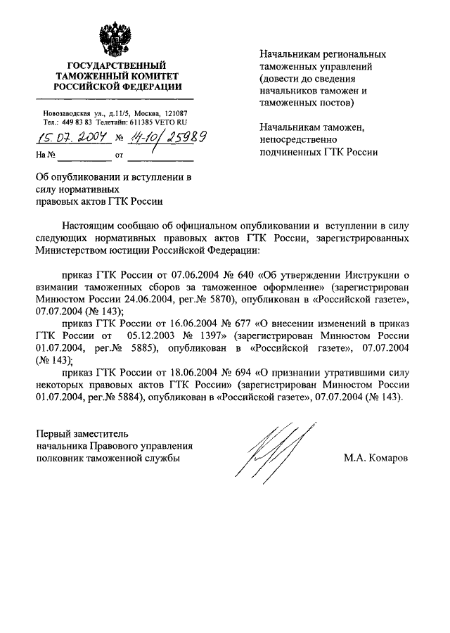 ПИСЬМО ГТК РФ от 15.07.2004 N 14-10/25989