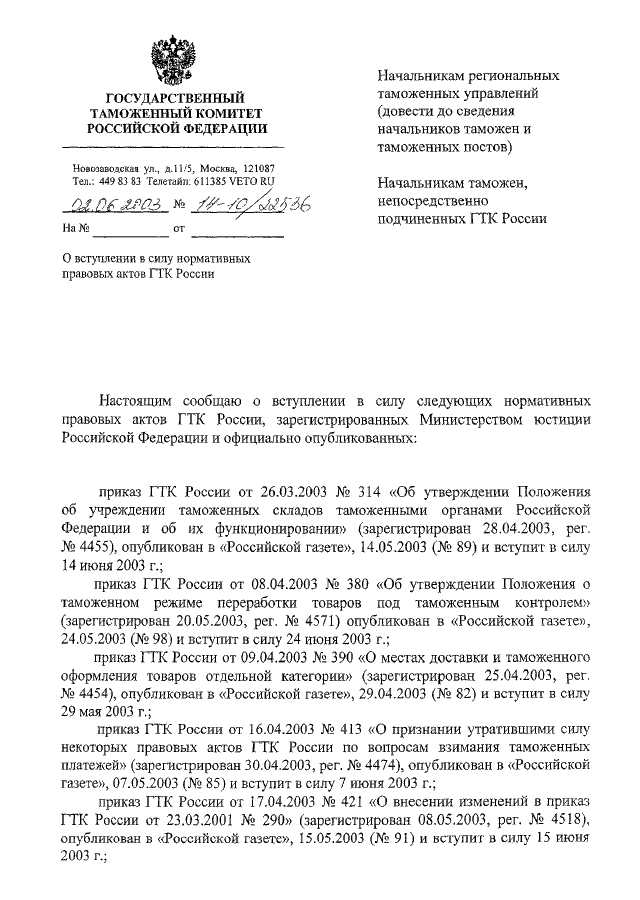 ПИСЬМО ГТК РФ от 02.06.2003 N 14-10/22536