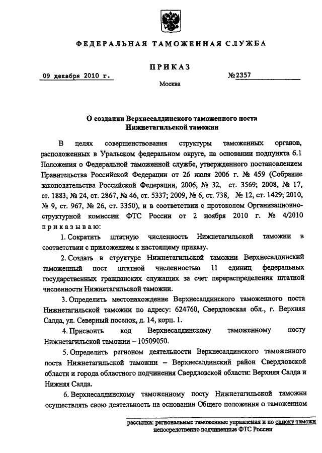 ПРИКАЗ ФТС РФ от 09.12.2010 N 2357
