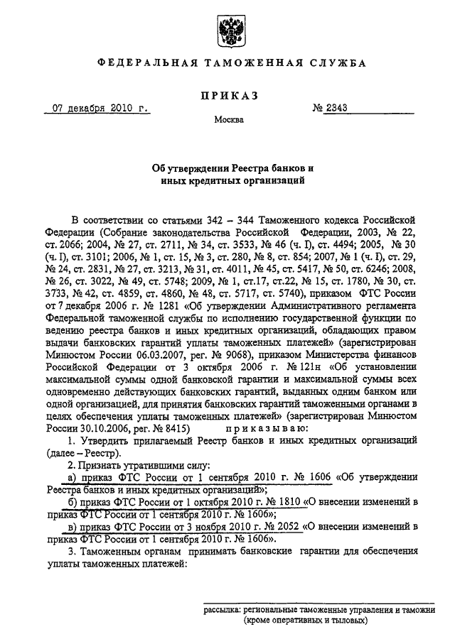 ПРИКАЗ ФТС РФ от 07.12.2010 N 2343