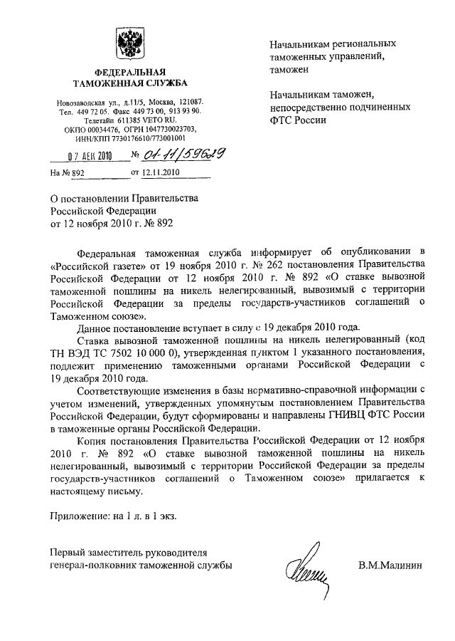 ПИСЬМО ФТС РФ от 07.12.2010 N 01-11/59629