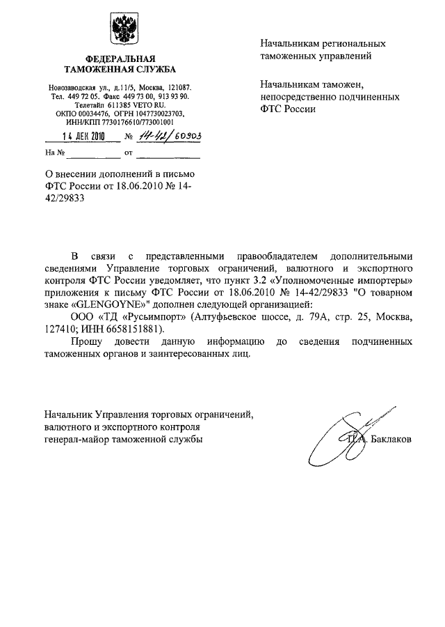 "О ВНЕСЕНИИ ДОПОЛНЕНИЙ В ПИСЬМО ФТС РОССИИ ОТ 18.06.2010 N 14-42/29833"