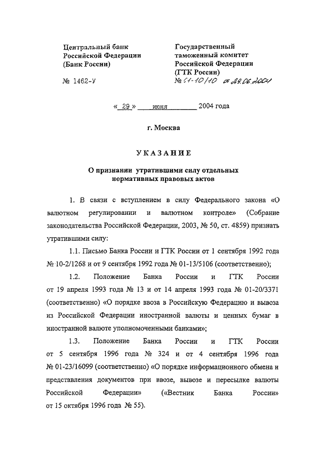 УКАЗАНИЕ ЦБ РФ N 1462-У, ГТК РФ N 01-10/10 от 29.06.2004