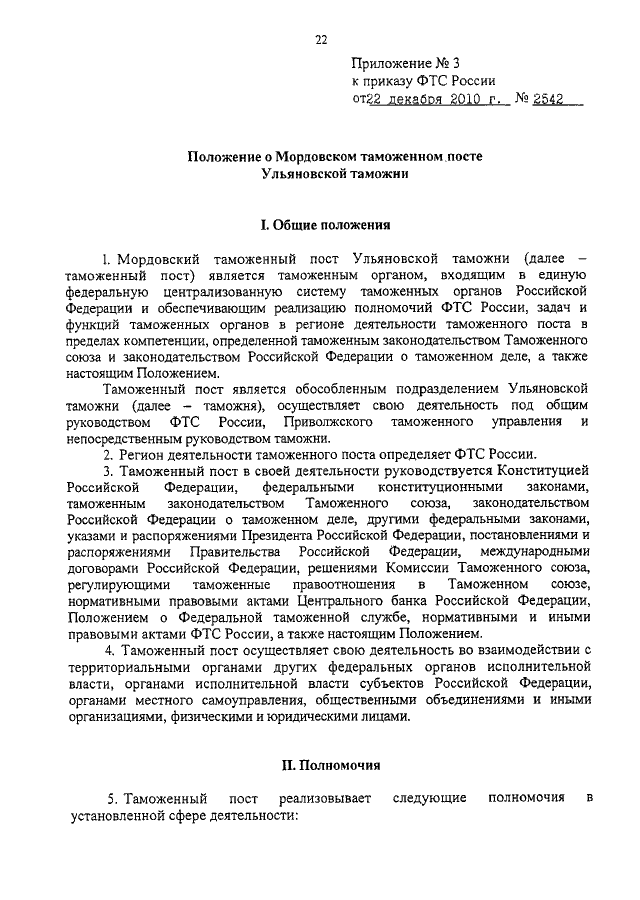 ПРИКАЗ ФТС РФ от 22.12.2010 N 2542