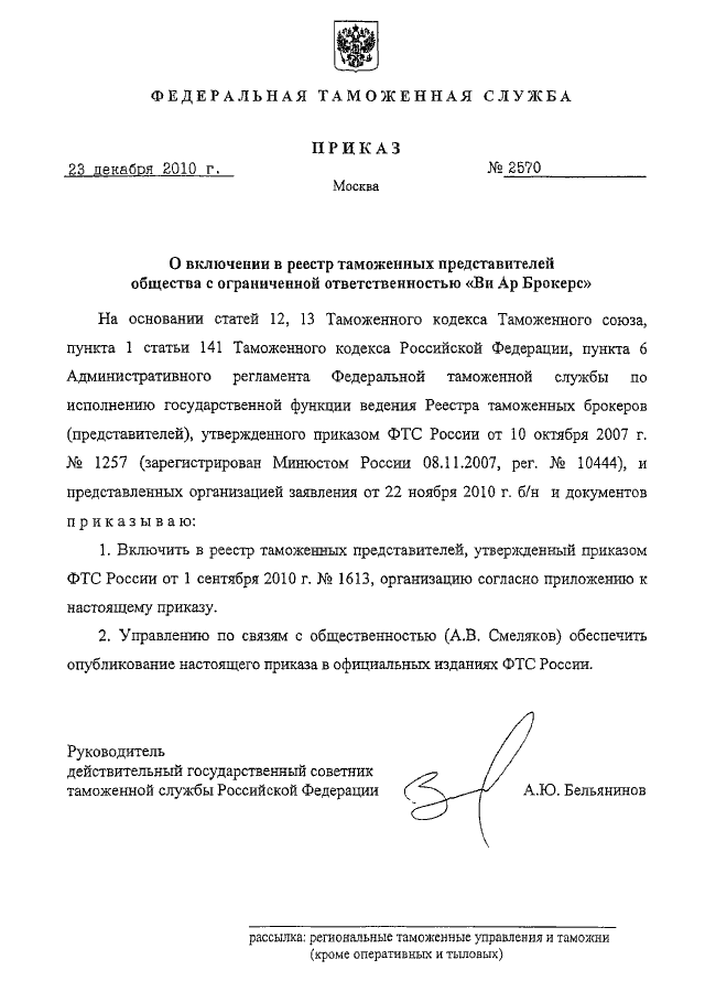 ПРИКАЗ ФТС РФ от 23.12.2010 N 2570