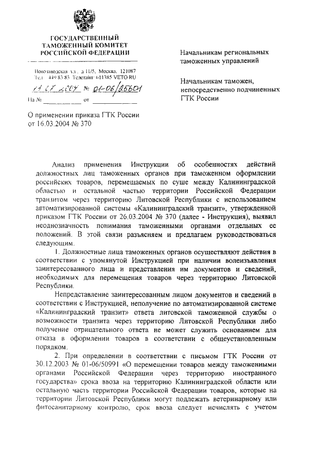 "О ПРИМЕНЕНИИ ПРИКАЗА ГТК РОССИИ ОТ 16.03.2004 N 370"