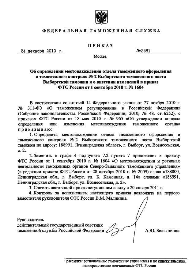 ПРИКАЗ ФТС РФ от 24.12.2010 N 2581