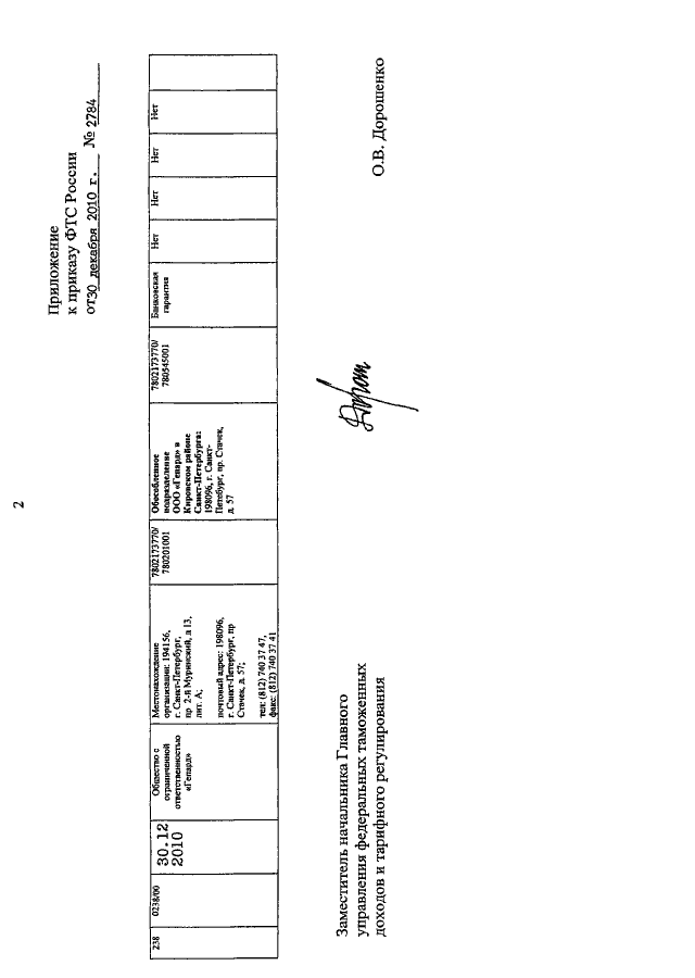 ПРИКАЗ ФТС РФ от 30.12.2010 N 2784