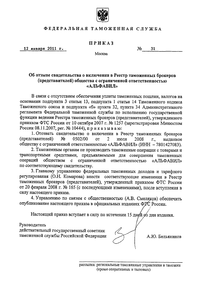 "ОБ ОТЗЫВЕ СВИДЕТЕЛЬСТВА О ВКЛЮЧЕНИИ В РЕЕСТР ТАМОЖЕННЫХ БРОКЕРОВ (ПРЕДСТАВИТЕЛЕЙ) ОБЩЕСТВА С ОГРАНИЧЕННОЙ ОТВЕТСТВЕННОСТЬЮ "АЛЬФАВИЛ"