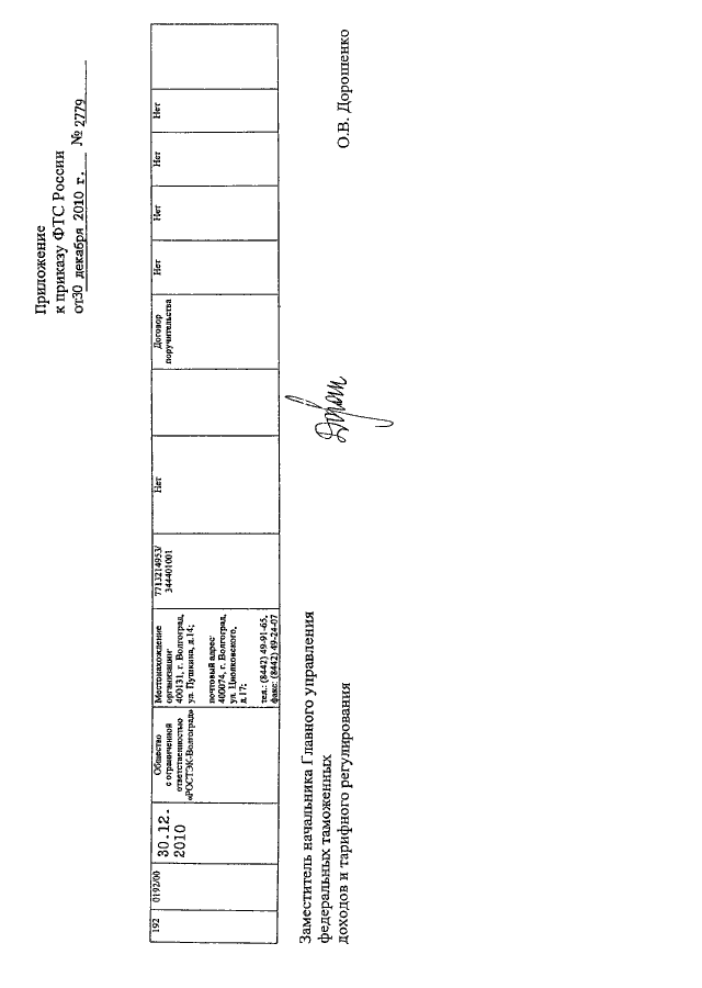 ПРИКАЗ ФТС РФ от 30.12.2010 N 2779