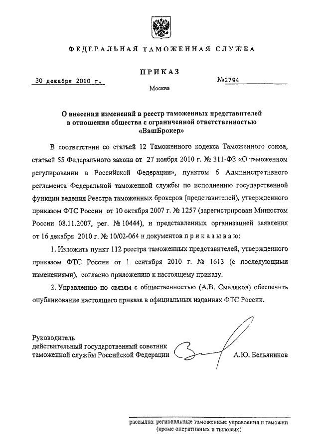 ПРИКАЗ ФТС РФ от 30.12.2010 N 2794