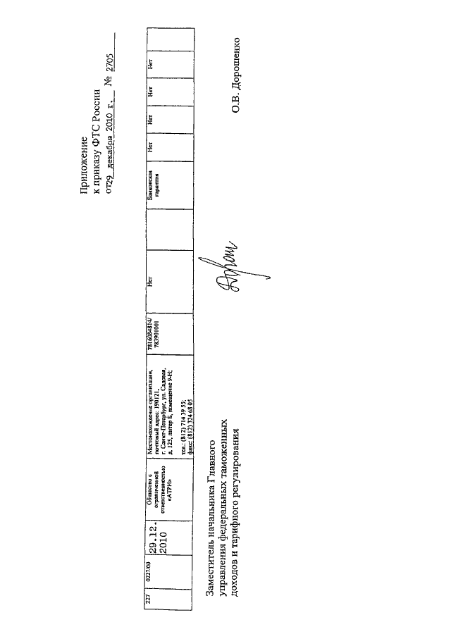ПРИКАЗ ФТС РФ от 29.12.2010 N 2705