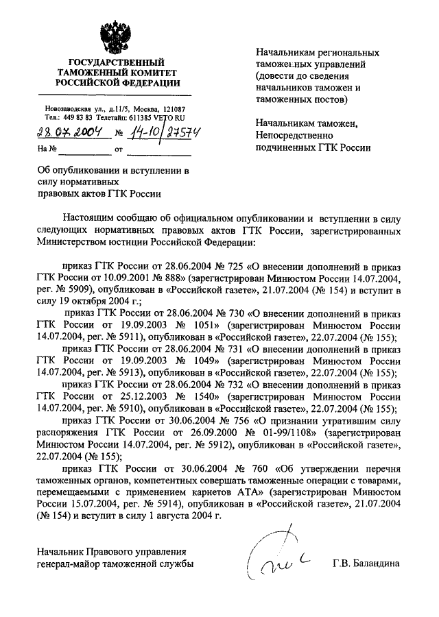 ПИСЬМО ГТК РФ от 28.07.2004 N 14-10/27574