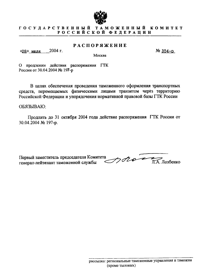 РАСПОРЯЖЕНИЕ ГТК РФ от 28.07.2004 N 354-р