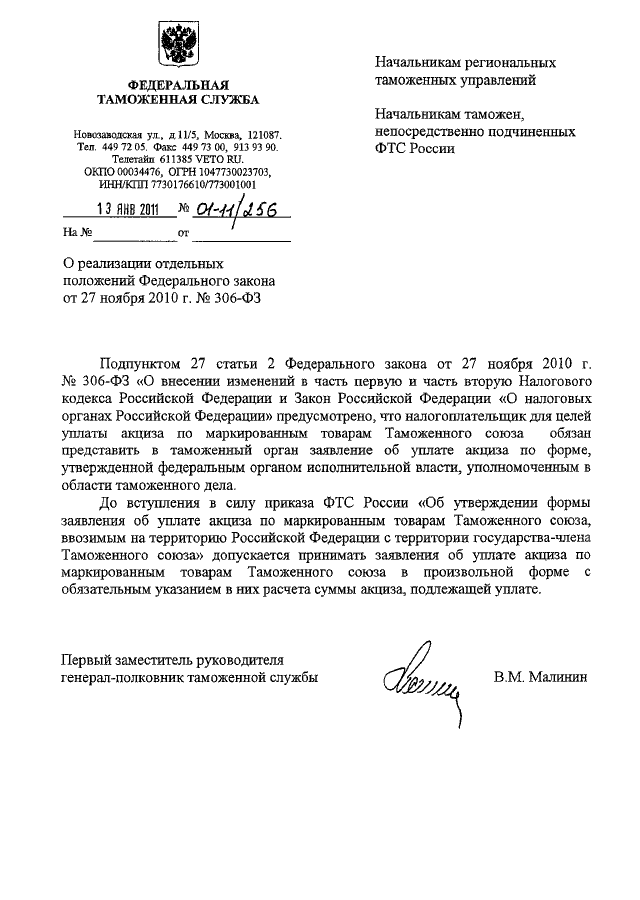 ПИСЬМО ФТС РФ от 13.01.2011 N 01-11/256