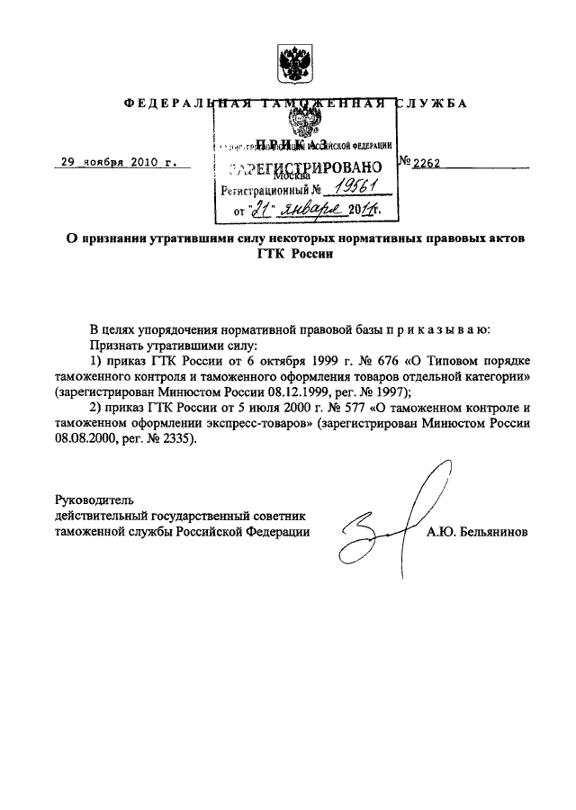 ПРИКАЗ ФТС РФ от 29.11.2010 N 2262