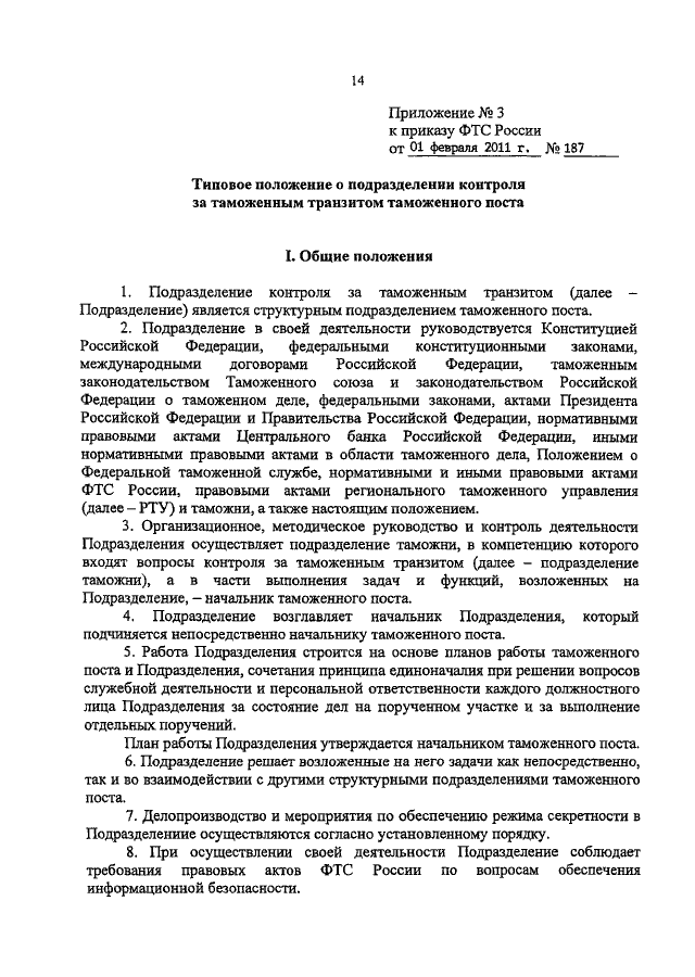 ПРИКАЗ ФТС РФ от 01.02.2011 N 187