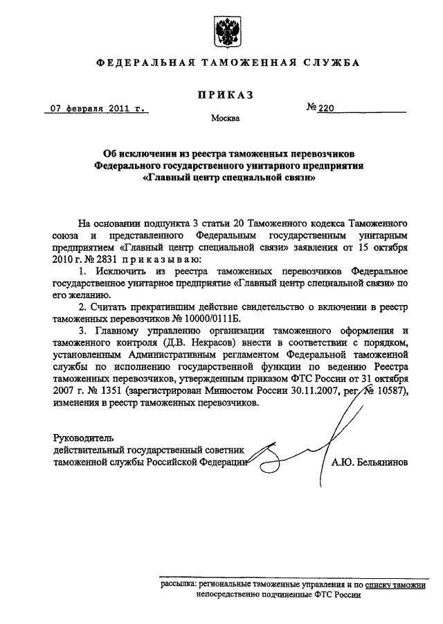"ОБ ИСКЛЮЧЕНИИ ИЗ РЕЕСТРА ТАМОЖЕННЫХ ПЕРЕВОЗЧИКОВ ФЕДЕРАЛЬНОГО ГОСУДАРСТВЕННОГО УНИТАРНОГО ПРЕДПРИЯТИЯ "ГЛАВНЫЙ ЦЕНТР СПЕЦИАЛЬНОЙ СВЯЗИ"