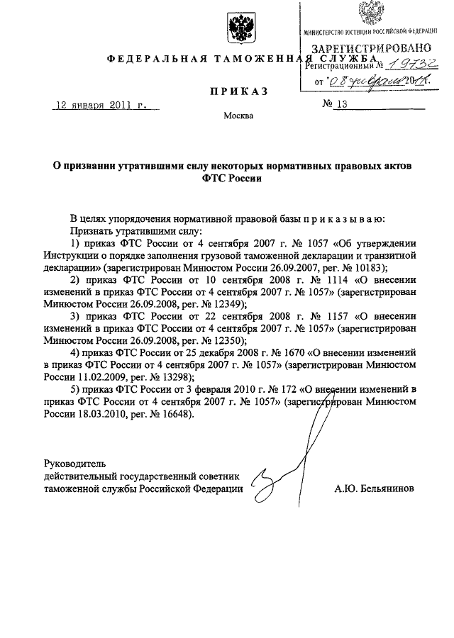 ПРИКАЗ ФТС РФ от 12.01.2011 N 13