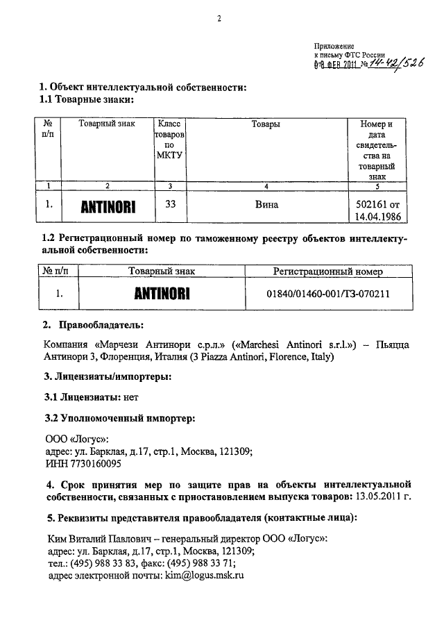 "О ТОВАРНОМ ЗНАКЕ "ANTINORI"