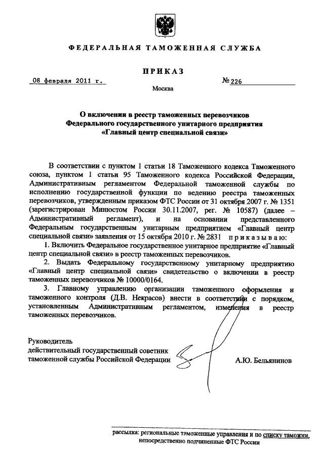 "О ВКЛЮЧЕНИИ В РЕЕСТР ТАМОЖЕННЫХ ПЕРЕВОЗЧИКОВ ФЕДЕРАЛЬНОГО ГОСУДАРСТВЕННОГО УНИТАРНОГО ПРЕДПРИЯТИЯ "ГЛАВНЫЙ ЦЕНТР СПЕЦИАЛЬНОЙ СВЯЗИ"