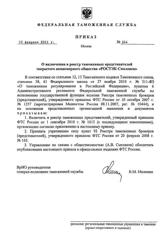 ПРИКАЗ ФТС РФ от 10.02.2011 N 264