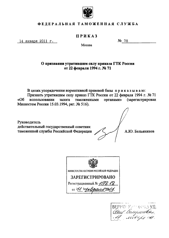 ПРИКАЗ ФТС РФ от 14.01.2011 N 78