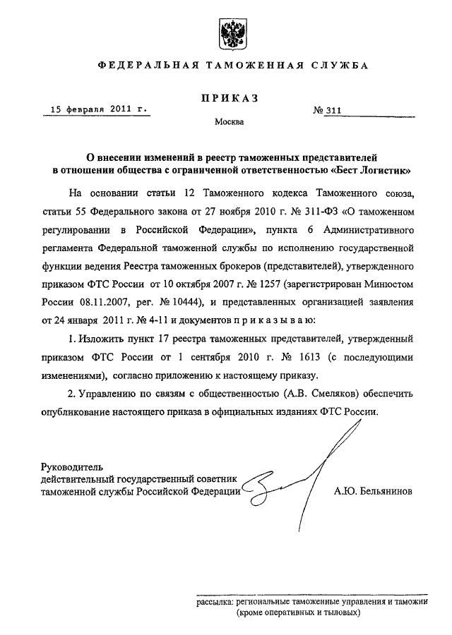 "О ВНЕСЕНИИ ИЗМЕНЕНИЙ В РЕЕСТР ТАМОЖЕННЫХ ПРЕДСТАВИТЕЛЕЙ В ОТНОШЕНИИ ОБЩЕСТВА С ОГРАНИЧЕННОЙ ОТВЕТСТВЕННОСТЬЮ "БЕСТ ЛОГИСТИК"