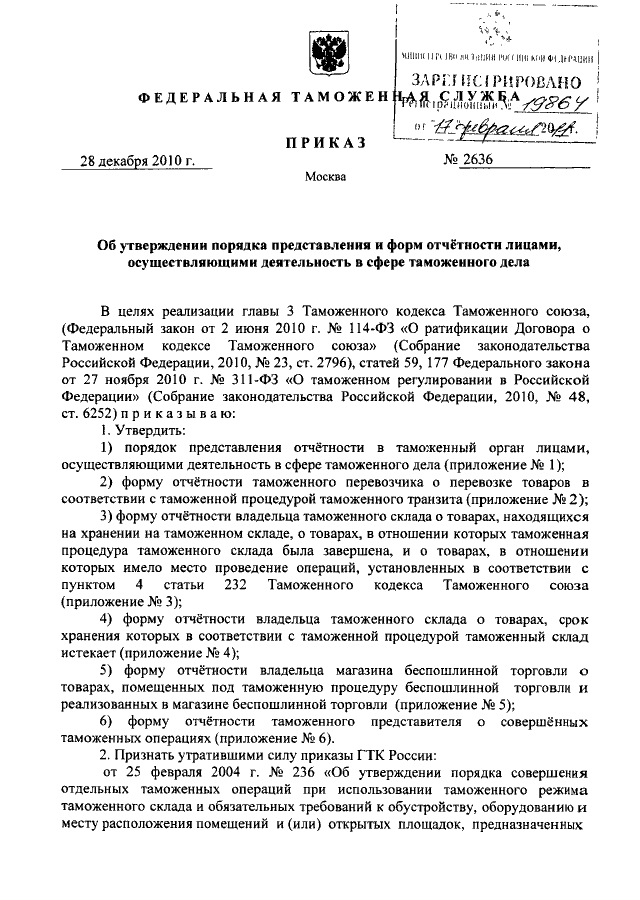 ПРИКАЗ ФТС РФ от 28.12.2010 N 2636
