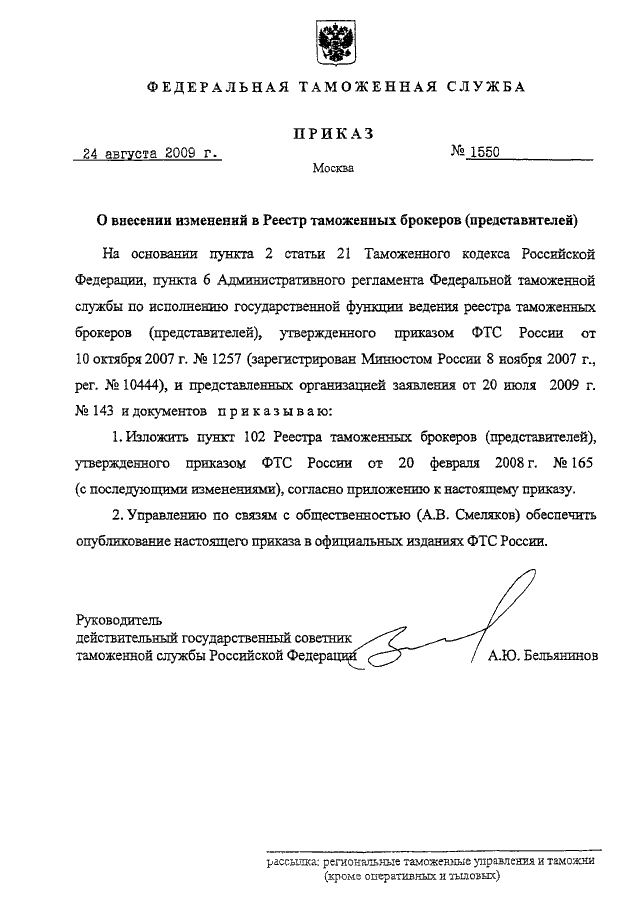 ПРИКАЗ ФТС РФ от 24.08.2009 N 1550