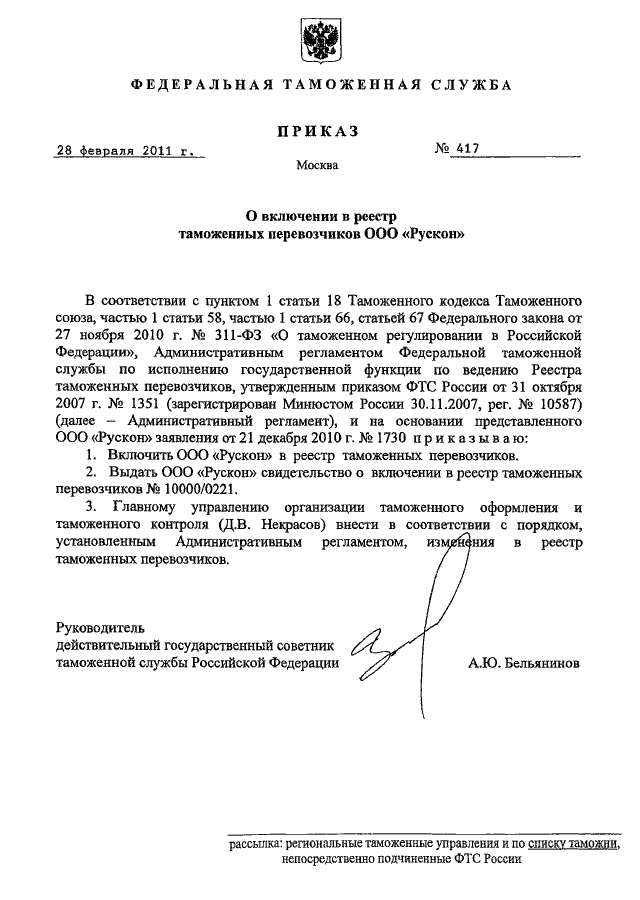 "О ВКЛЮЧЕНИИ В РЕЕСТР ТАМОЖЕННЫХ ПЕРЕВОЗЧИКОВ ООО "РУСКОН"