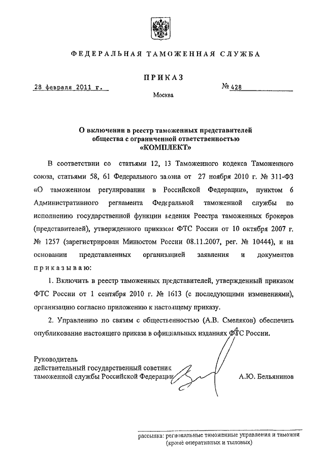 ПРИКАЗ ФТС РФ от 28.02.2011 N 428
